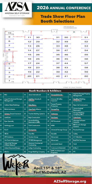 - Vendor Spotlight Webinar: Schedule yours by April 5, 2026, for maximum trade show impact. Contact Amy Amideo at AZSA@AZselfstorage.org.